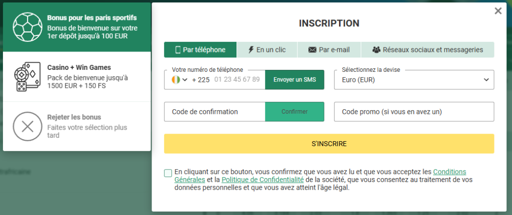 Avant de commencer à faire des paris sportifs, vous devez vous inscrire. Pour faire cela, vous devez premièrement fournir votre adresse e mail, puis fournir un numéro de téléphone. Vous devez aussi accepter les termes et conditions de Betwinner. Une fois que vous avez confirmé cela, vous pouvez créer un mot de passe et un nom d’utilisateur.